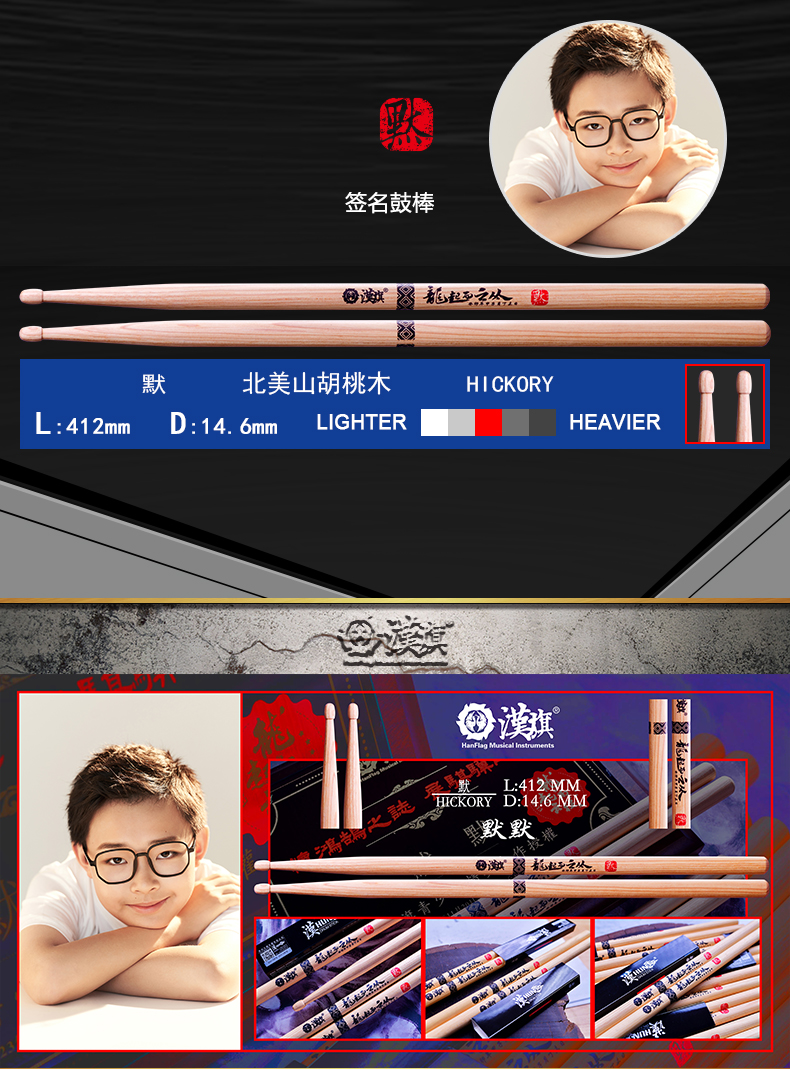 汉旗代言人默默签名款架子鼓鼓棒少年精英 鸿鹄之志系列