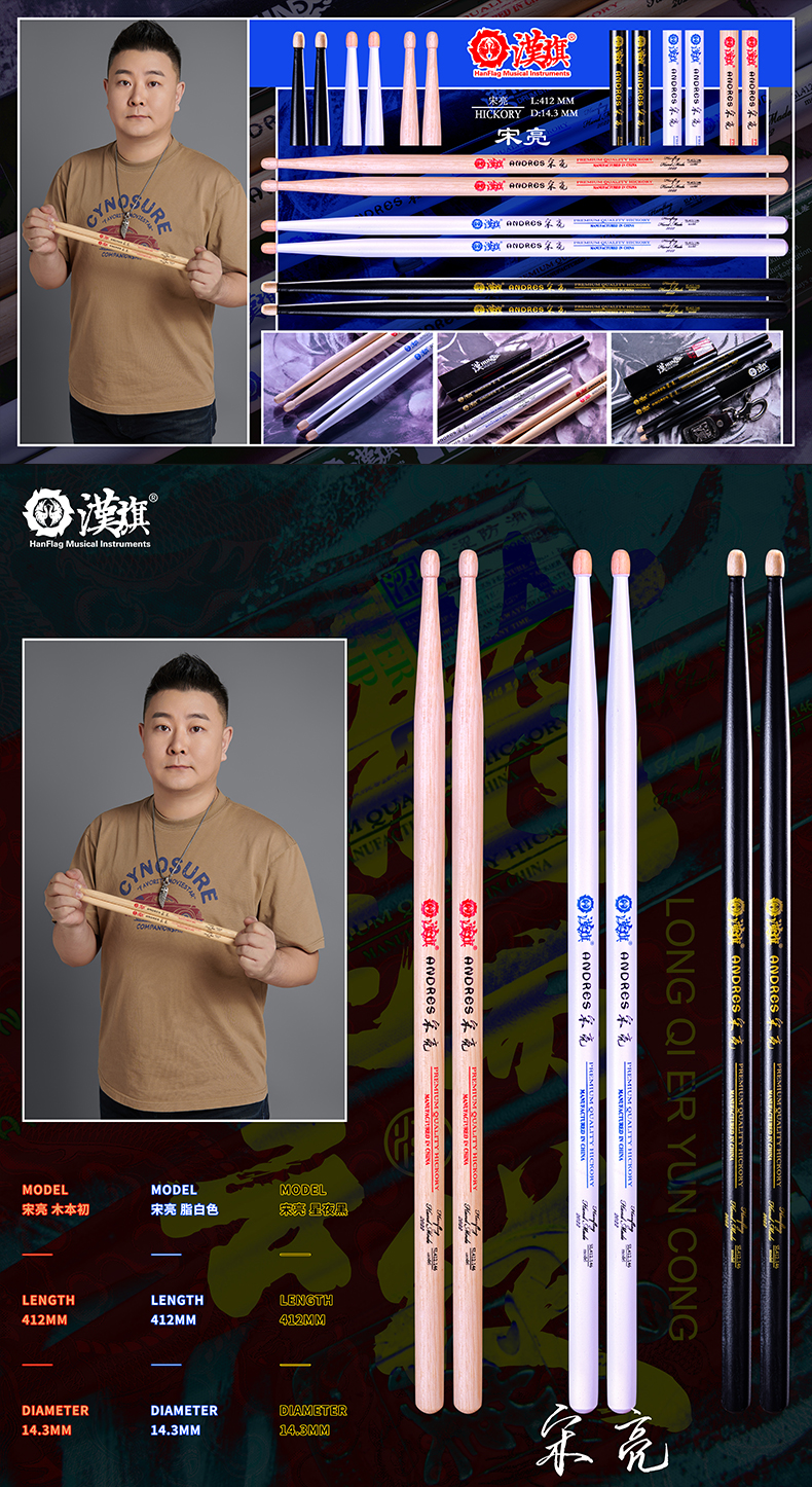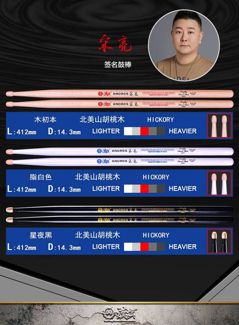 详细简介:官方小程序直通:漢旗代言人 宋亮 签名款鼓棒架子鼓鼓槌 北美山胡桃木